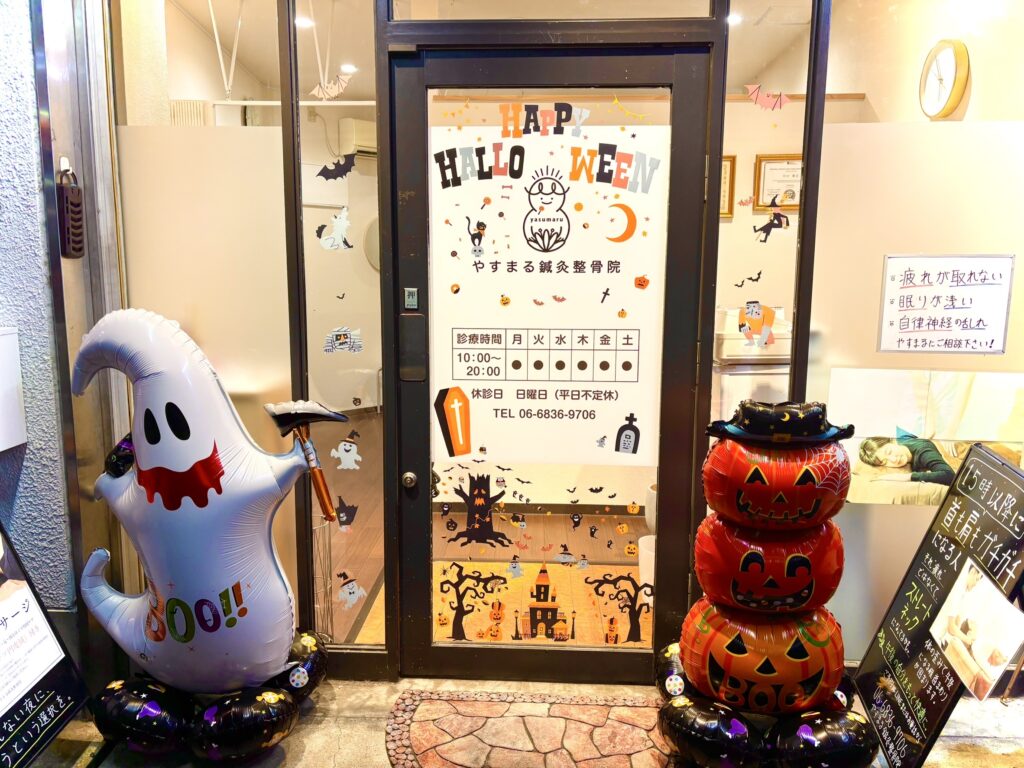 やすまる鍼灸整骨院の入口も、季節の移り変わりに合わせてハロウィン仕様に変わりました🎃